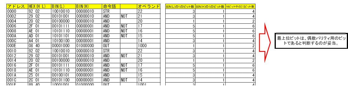 小一時間ほどあれこれ考えている内に、ニーモニックの命令語と16進ダンプリストを比較すればわかりそうな気がして、エクセルにぽちぽちと入力してダンプリストとニーモニックを比較。